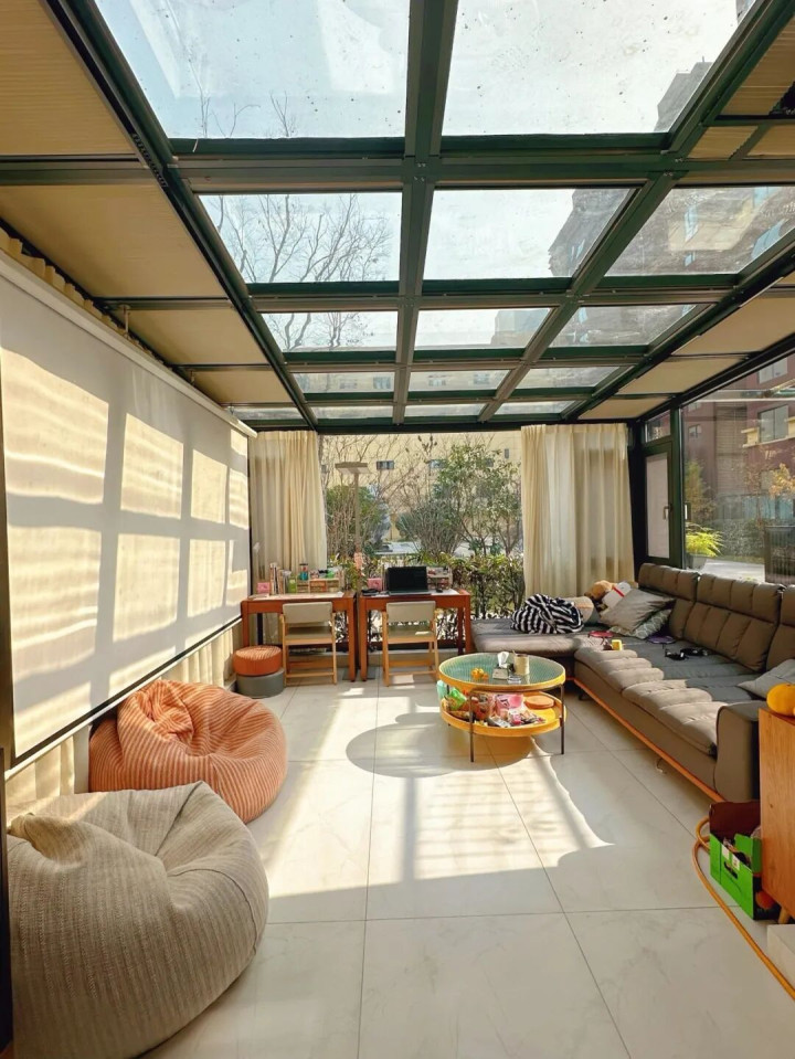 03、一楼带院何如纠正避坑? 1)作念好透风和除湿 装置空调、除湿机,平常多开窗透风,也不错把阳台改成推拉门,加多透风面积,减少家里的潮气,幸免墙壁、产物受潮发霉。 2)给小院装个阳光房 打造阳光房,既能挡住高空抛物,又能防蚊虫,还不影响采光,平常不错在内部曝晒穿着、喝茶,无谓再顾忌高空抛物和蚊虫的问题,还能加多不少使用空间。