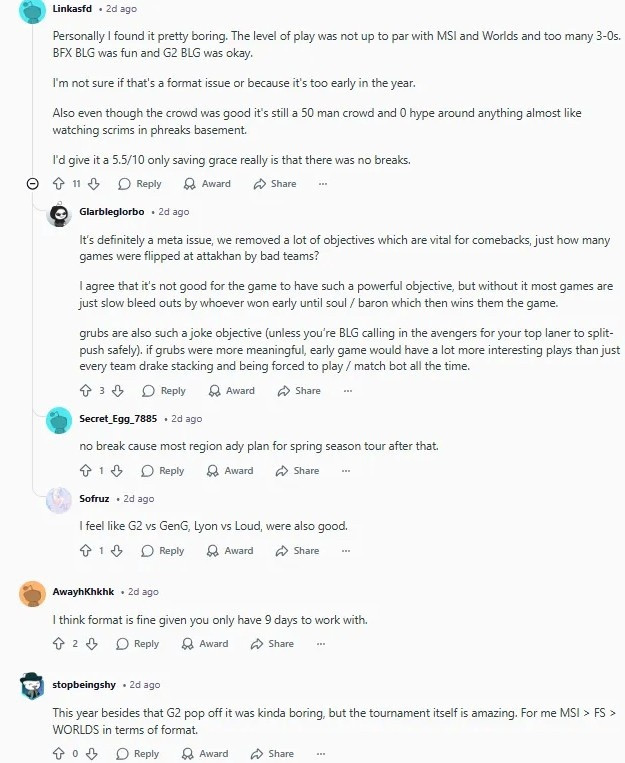 就我个东谈主而言,我以为相等败兴。比赛水平莫得达到MSI和宇宙赛的次第,况兼出现了太多3-0的零封。BFX对阵BLG的比赛很意念念,G2对阵BLG的比赛还可以。 我不笃定这是赛制的问题,照旧因为当前处于一年中的起步阶段。 另外,尽管现场不雅众氛围可以,但毕竟只须戋戋50名不雅众,比赛毫无氛围,险些就像是在Phreak的地下室里看考验赛通常。 我给打5.5/10分,这项赛事独一的亮点即是比赛本事莫得休息日。 这竣工是版块的问题。打算师移除了好多对翻盘至关繁难的中立资源,想想看有若干场比赛是颓势队列靠着厄塔汗翻盘的? 我承诺让游戏中存在这样巨大的野怪并不是功德,但淌若莫得它,大多数比赛只会酿成前期上风方的“慢性物化”局——上风方徐徐蚕食,直到拿下龙魂或大龙,然后赢下比赛。 虚空巢虫当前亦然个见笑般的资源(除非你是BLG,能呼唤“复仇者定约”来确保你们的上单可以安全单带)。淌若虚空巢虫能更有战术意旨,前期的比赛就会有更多意念念的博弈,而不是当前这样每支队列齐在无脑控小龙,然后被动一直围绕下路打。 莫得休息日是因为大多数赛区在这项赛事之后,齐也曾安排了春季赛的行程。 [-]Sofruz 我以为G2对阵GenG,Lyon对阵Loud的比赛也很精彩。 商酌到官方只须9天的时辰来安排通盘这个词比赛,我以为这赛制也曾很可以了。 本年除了G2爆种之外,照实有点败兴,九游体育但这项赛事自己照旧很棒的。对我来说,单论赛制的话:MSI>前锋赛>WORLDS。
