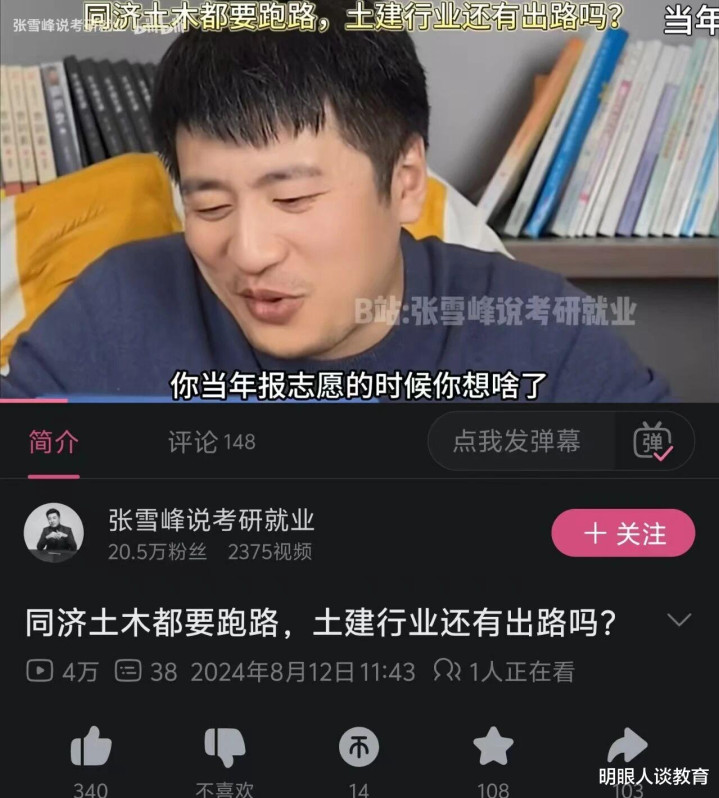 内部提到了行状远景,张诚笃说行状远景可以说曲直常的可以。 禁止他这个视频的时辰是20年。 大学生比拟多的平台其实也有东说念主在发对于专科上风和弊端的一些个东说念主体会。 在这个期间基本上土木匠程专科属于轻蔑链的卑劣,计算机传闻还莫得破损,专家崇敬的齐是像计算机这样的专科,一些跟计算机沾边的专科保举齐是飞快转码狠狠赚一笔,往互联网公司跑。 张雪峰诚笃其时发的视频亦然成为了背面许多东说念主质疑他明知山有虎,偏向虎山行的论据之一。 张雪峰诚笃在视频内部讲到土木匠程专科的行状远景还曲直常的可以。 这是前提。 原来这个视频发了其实还没如何发酵。 着实把这个事情推上飞扬的是四年之后,张雪峰诚笃另一个切片视频。 他在直播间里遭受来商讨的大学生。 这个大学生说他报的是土木匠程专科。 在2024年之后土木匠程专科行状不如何行了。 张雪峰诚笃其时一脸戏谑地问他你昔时报志愿的期间你想啥了?