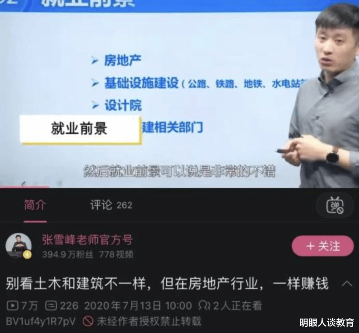 这几天张雪峰的事亦然引起许多柔和,尤其是之前对于土木匠程专科的事情也被从头拿出来筹划,许多东说念主不了了其时筹划的论点是什么,我梗概追念一下。 最启动等于2020年张雪峰诚笃发的一个视频,内部有他教化土木匠程专科的本色。 其时他阿谁视频的题目叫作念别看土木和树立不一样,但在房地产行业一样赢利。