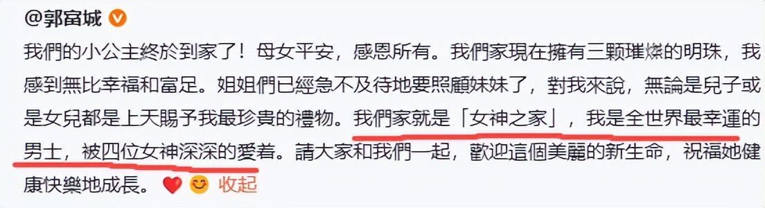 由于开通诞下三位令嫒加之郭富城年届花甲喜得幼女网罗上一度出现“肩负传嗣重负”的声息无形中给方媛施加了出奇压力。 三犬子返家当日郭富城即刻在酬酢平台精通发声“非论男孩女孩都是侥幸赠给的至宝。咱们家是名副其实的‘女神定约’——四位女性用爱包围着我让我成为世间最侥幸的男东谈主。”