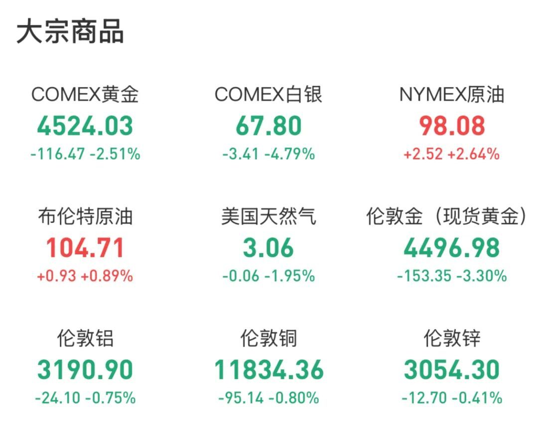 科技股惨遭血洗,Magnificent 7共计市值单日挥发逾4000亿好意思元。特斯拉TSLA跌3.24%领跌科技巨头,英伟达NVDA跌3.15%,Meta META跌1.47%,谷歌GOOGL跌1.04%,苹果AAPL跌1.69%,微软MSFT跌1.91%,亚马逊AMZN跌2.48%。Mag 7指数跌2.03%,科技巨头集体熄火株连大盘。 值得扎眼的是,好意思联储周三上调2026年PCE通胀预期至2.7%,点阵图显现本年仅降息一次,市集此前预期至少两次降息,这一落差径直引爆了本周的抛售潮。摩根大通则因通胀担忧将好意思联储降息预期时候从6月推迟至9月,此前其预测为6月和9月各降息25个基点,现在磋商9月和12月各降息25个基点。 02 油价抓续拉升 新手对异日保抓严慎 WTI原油周五收涨2.66%报98.09好意思元每桶,布伦特原油一度涨近11%至112好意思元后涨幅收窄。好意思伊冲突三周以来,布伦特原油累计涨近50%。