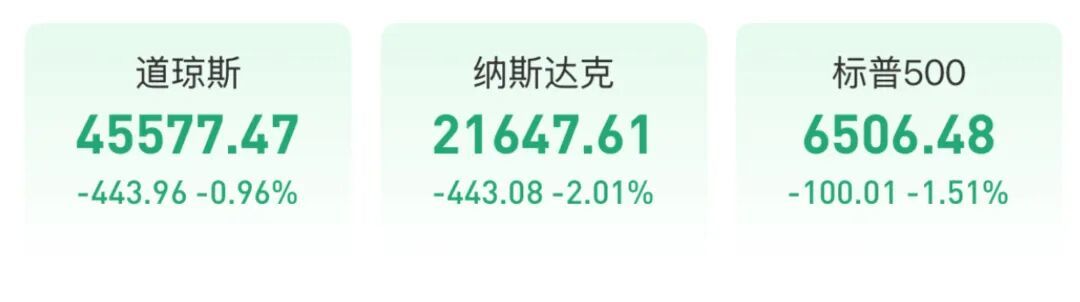 好意思股周五收盘,三大指数全线大跌。谈琼斯指数收于45577.47点,跌437.33点跌幅0.96%;标普500指数收于6506.48点,跌99.49点跌幅1.51%;纳斯达克指数收于21647.61点,跌444.75点跌幅2.01%领跌大盘。