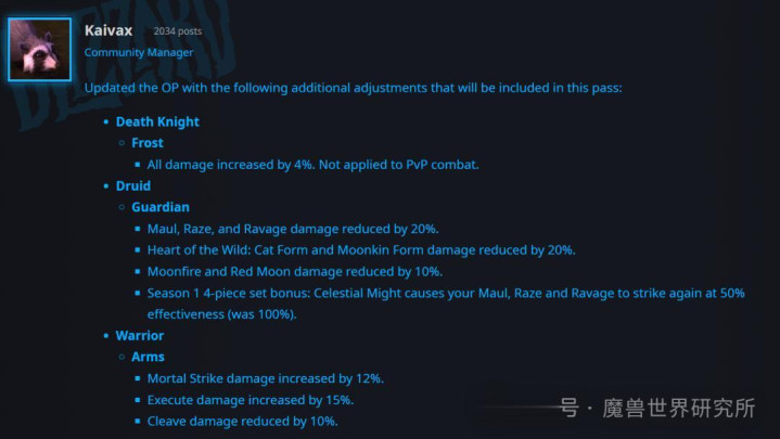 牺牲骑士 冰霜 总共伤害擢升4%。不影响PvP。 德鲁伊 看护 重殴、恣虐和吃亏形成的伤害裁汰20%。 野性之心:猎豹样式和枭兽样式形成的伤害裁汰20%。 月火术和赤红之月形成的伤害裁汰10%。 第一赛季劳动套装4件套成果:天使之力使你的重殴、恣虐和吃亏以50%的成果再次瑕疵(原为100%) 战士 火器 致死打击伤害擢升12%。 斩杀伤害擢升15%。 顺劈斩伤害裁汰10%九游官方网站。 21点游戏官方网站 |