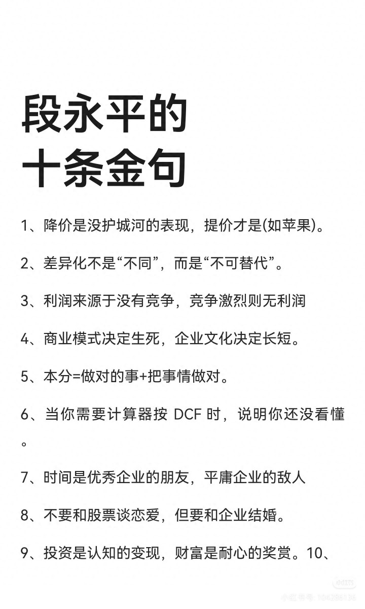 1️⃣ 护城河决定高度 “降价是没护城河的领悟,提价才是。” 我之前总以为“薄利多销”才稳,服从越作念越累。 信得过的好公司,像苹果、茅台,越提价越抢,因为它们在用户心里不可替代。 2️⃣ 互异化的终极是不可替代 不是作念得不同样,而是别东说念主根底替代不了。 我们普通东说念主选股票,别只看“见解新”,要看它能不成筑起这说念“别东说念主跨不外去的墙”。 3️⃣ 利润源于“无竞争” “利润开头于莫得竞争,竞争热烈则无利润。” 这即是为什么我当今重仓长江电力、伊利、招行。 它们齐是各自赛说念里的总共龙头,竞争形状明晰,利润能稳稳落袋。 4️⃣ 营业模式定死活,企业文化定短长 公司能活多久,看营业模式;能走多远,看企业文化。 买股票=买公司,连雇主和文化齐看不懂的,坚韧不碰。 5️⃣ 分内:作念对的事+把事情作念对 这是投资的底层逻辑。 不赚领悟外的钱,不懂的行业坚韧不碰; 手里拿着优质资产,就别嫌它涨得慢,把事情作念对,剩下的交给时刻。 6️⃣ 看懂无谓算,用DCF计较器=没看懂 好多东说念主天天算估值,越算越乱。 段永平说,当你需要按计较器时,九游娱乐讲明你还没信得过看懂这家公司。 投资不是数学题,是判断力。 7️⃣ 时刻是优秀企业的一又友 “时刻是优秀企业的一又友,世俗企业的敌东说念主。” 我之前总换股,把优质筹码卖飞。 拉长周期看,唯有优秀企业能穿越牛熊,时刻越长,上风越昭着。 8️⃣ 不跟股票恋爱,要跟企业结婚 别因为涨了几天就满仓可爱,也别因为跌了几天就割肉离场。 股票是情怀,企业是价值。 和企业结婚,拿得住,才气拿得稳。 9️⃣ 领悟变现,耐烦赏赐 “投资是领悟的变现,钞票是耐烦的赏赐。” 我亏的每一分钱,齐是因为没耐烦。 别东说念主恐惧我贪心,别东说念主贪心我恐惧。 守住耐烦,才气拿到临了的果实。 贵与低廉,看翌日十年 “贵或低廉,齐是从翌日十年或更远的角度看。” 别被目下的涨跌诱骗。 望望长江电力、伊利这些公司,翌日十年能不成握续赢利? 能,那当今的下降,即是契机;不成,那当今的高潮,即是罗网。 把这10句话刻进心里,你会发现: 投资从来不是比谁跑得快,而是比谁更懂、更稳、更有耐烦。 守住领悟,守住分内,守住平方心,普通东说念主也能穿越牛熊。 #段永平 #价值投资 #投资金句 #普通东说念主应承 #长久办法 #投资领悟 #钞票升值九游体育 米兰体育官方网站 |