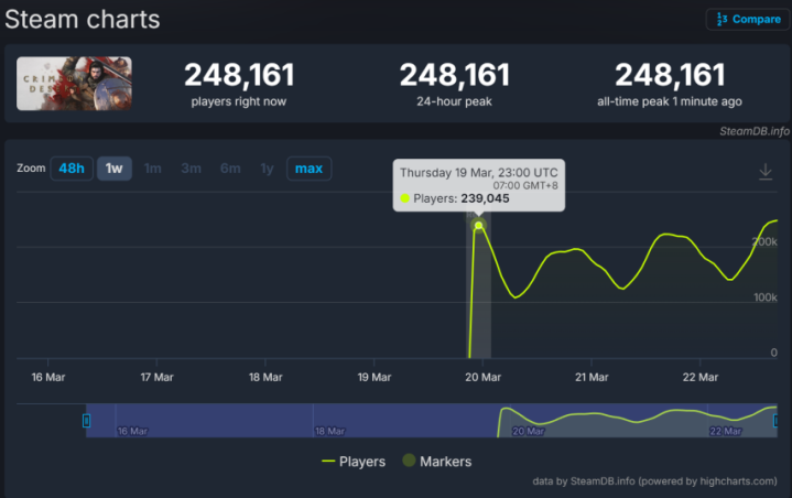 不仅如斯,游戏的Steam在线东说念主数这几天也并莫得回落,致使还再次达到了快要25万的最高值。