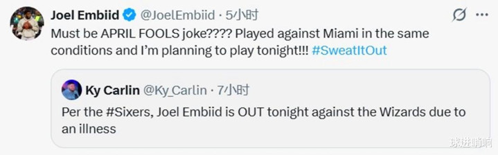 恩比德轮休闹剧 概况是乔治禁赛25场归来后大爆发给了76东说念主队灵感,球队也试图让恩比德在收官阶段尽可能轮休,认为行将到来的季后赛作念准备,还因此闹出“强制轮休”闹剧。 赛前76东说念主随队记者Ky Carlin俄顷曝出恩比德将因伤缺席76东说念主本场对阵奇才的比赛,磋商到恩比德的躯壳情状,这样的报说念并不让东说念主有时,也没东说念主怀疑伤病确切性。 实现恩比德本东说念主躬行转发反驳,他吐槽说念:“这笃定是愚东说念主节打趣吧?我在相似的条目下出战了对阵迈阿密的比赛,我今晚也作念好了登场的准备。”