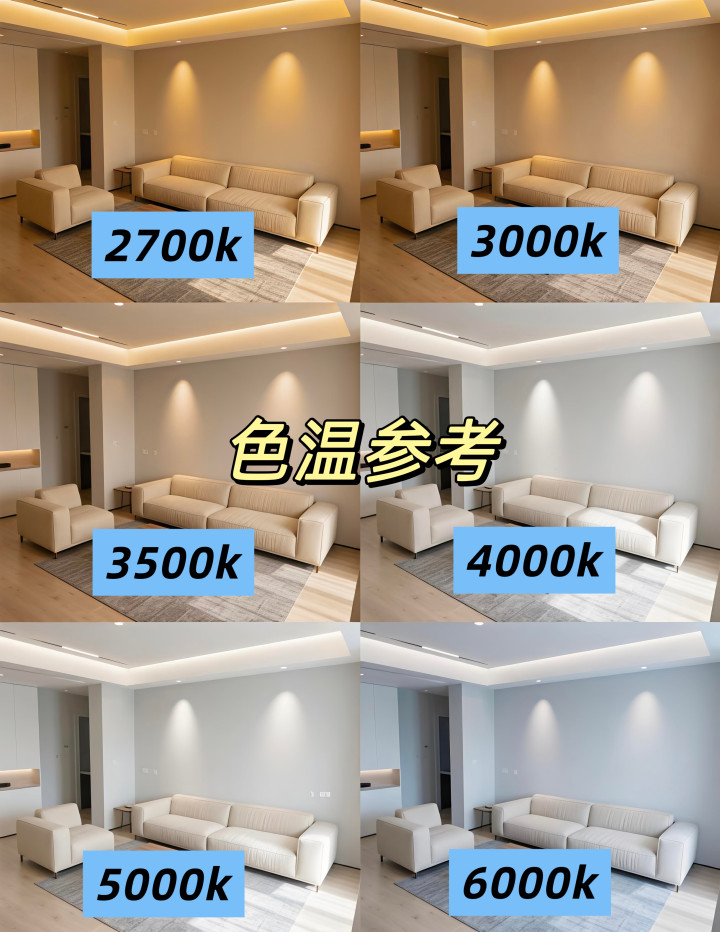 色温 个东谈主提议∶客厅3500~4500k,餐厅3000~3500k,卧室2700~3000k,厨房5500~6000k,卫生间4500k~5000k。