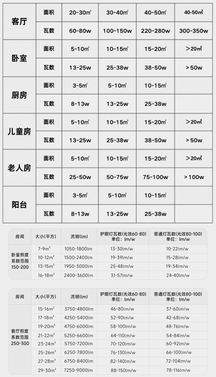 尺寸计算面目 瓦数越大灯越亮,基本上家里照明的场地每平常起码3~5瓦,不错参考下列灯具瓦数图↓