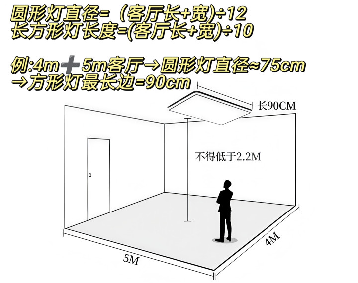 吸顶灯 一.尺寸/瓦数 尺寸你就记着一个公式,圆形灯直径=(客厅长+宽)÷12,长方形灯直径=(客厅长+宽)÷10,淌若不好计算,那么客厅空间就选80cm~110cm,卧室空间不错选45cm~60cm。